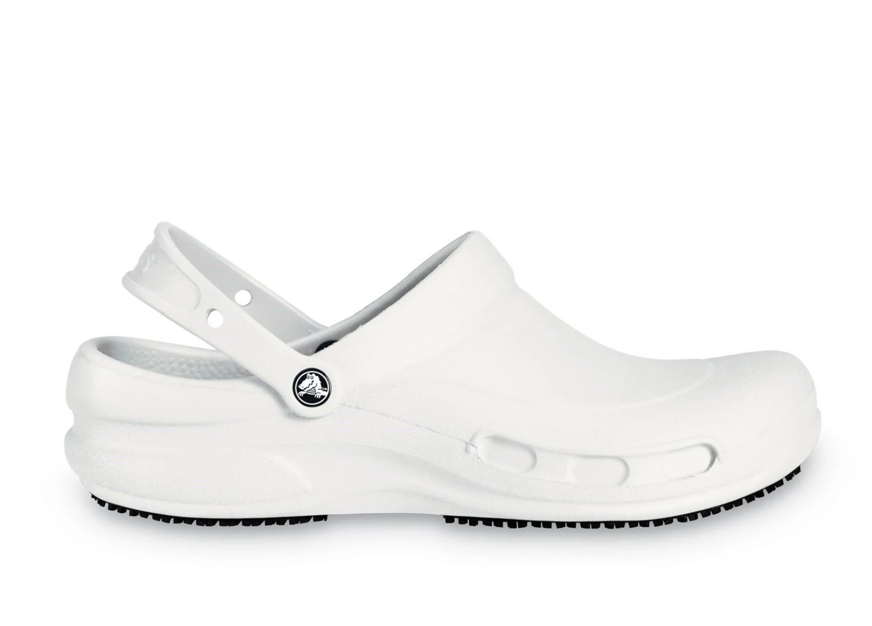 - El zueco Crocs Bistro utiliza un nuevo diseño de banda de rodadura, Crocs Lock, proporciona resistencia al deslizamiento que supera los estándares de la industria