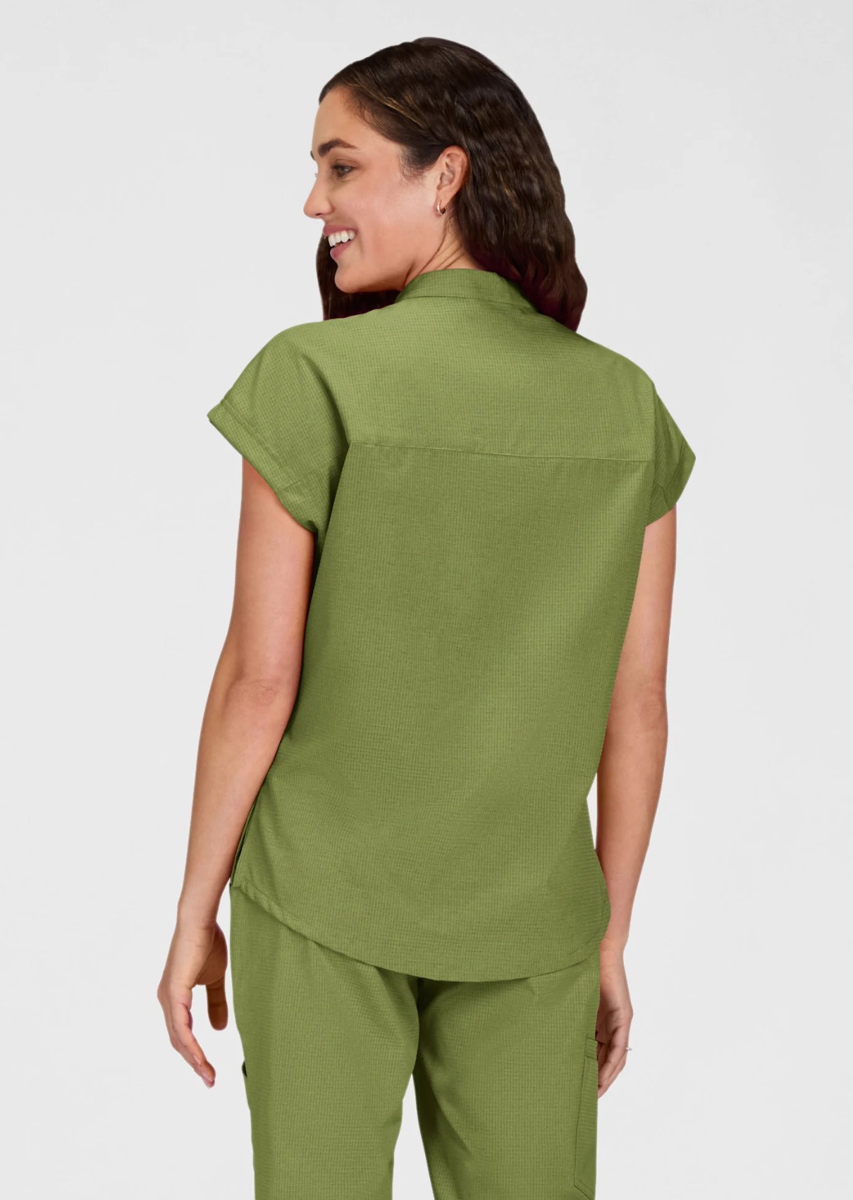 Moderna blusa médica confeccionada con tejido elástico antidesgarro ExoFlex™ ultrarresistente y suave como la seda. Corte moderno.