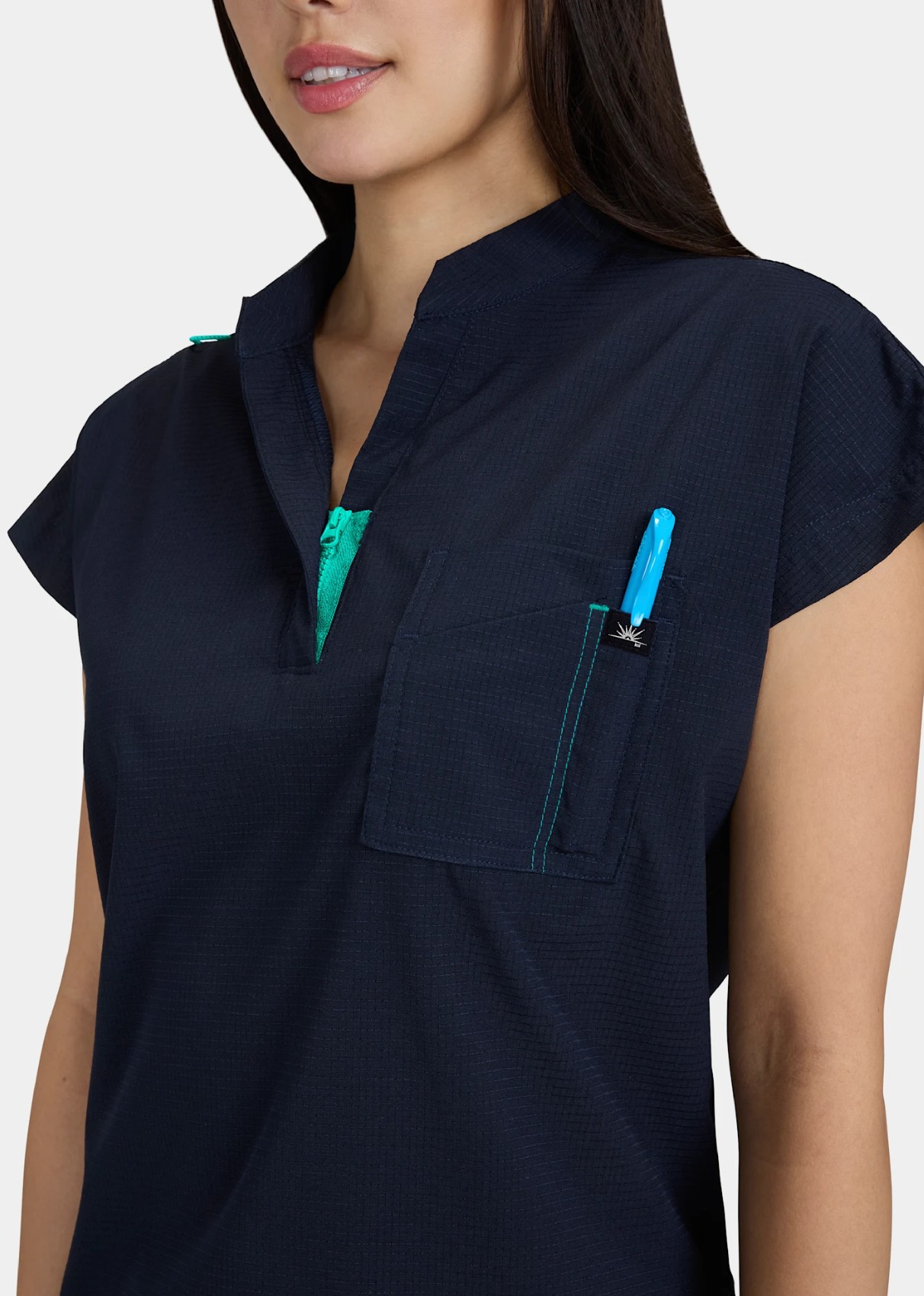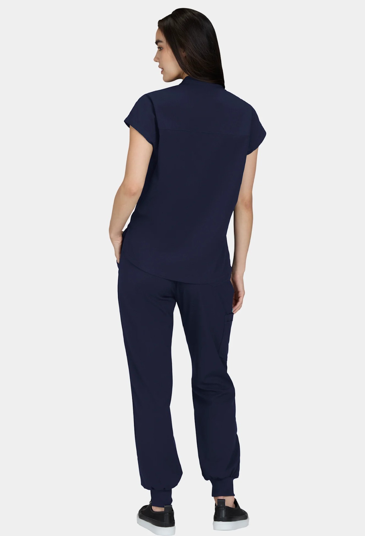 Moderna blusa médica confeccionada con tejido elástico antidesgarro ExoFlex™ ultrarresistente y suave como la seda. Corte moderno.